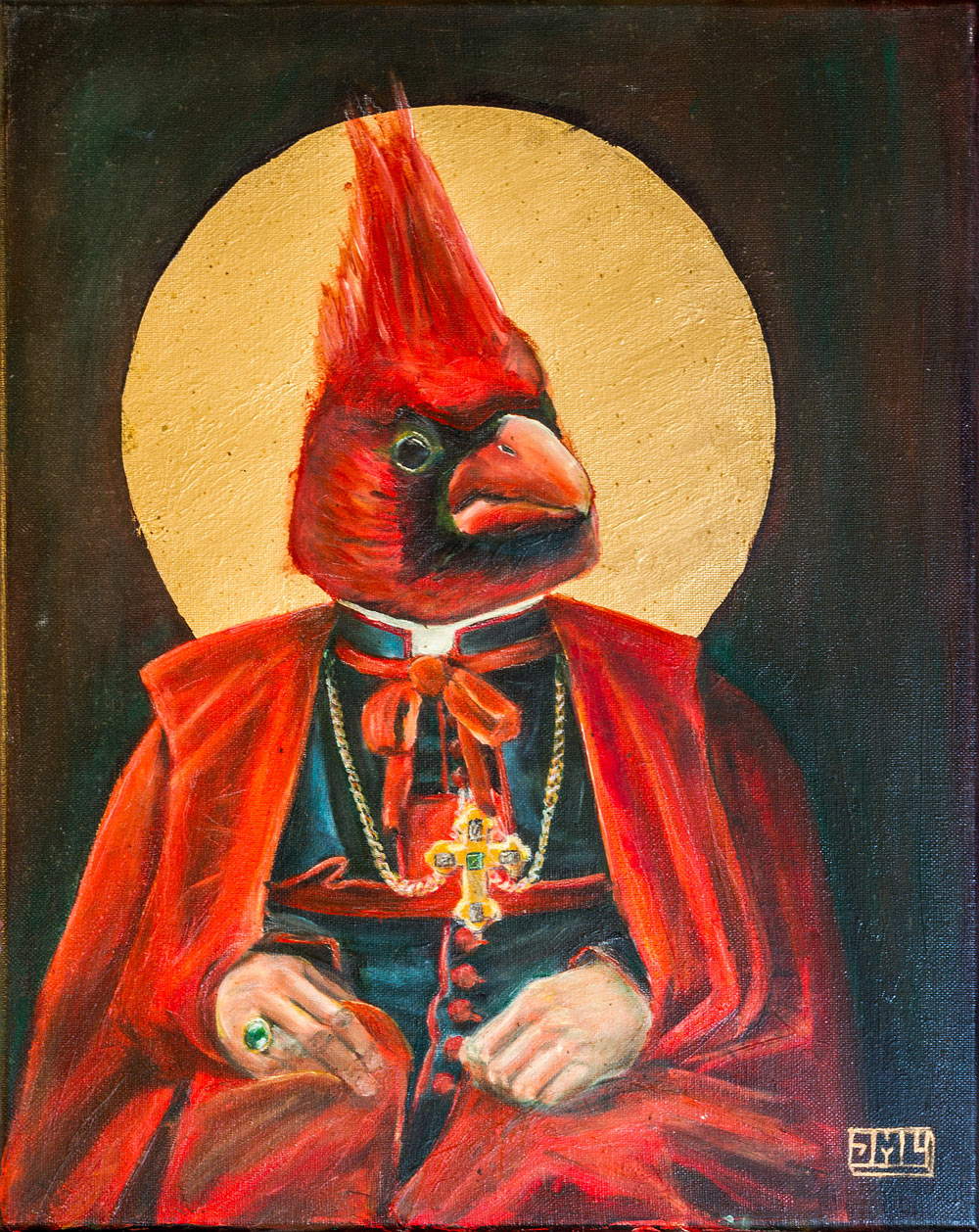 I painted this my senior year of college as a part of a series. This was the primary painting that lead to the development of the other paintings. The series was to express the absurdity of iconography in modern religions and their influence on art. Heavy Catholic influences from my childhood are evident as well as the connection to oil paintings that are common with Iconography from Byzantine and Orthodox Christian traditions.