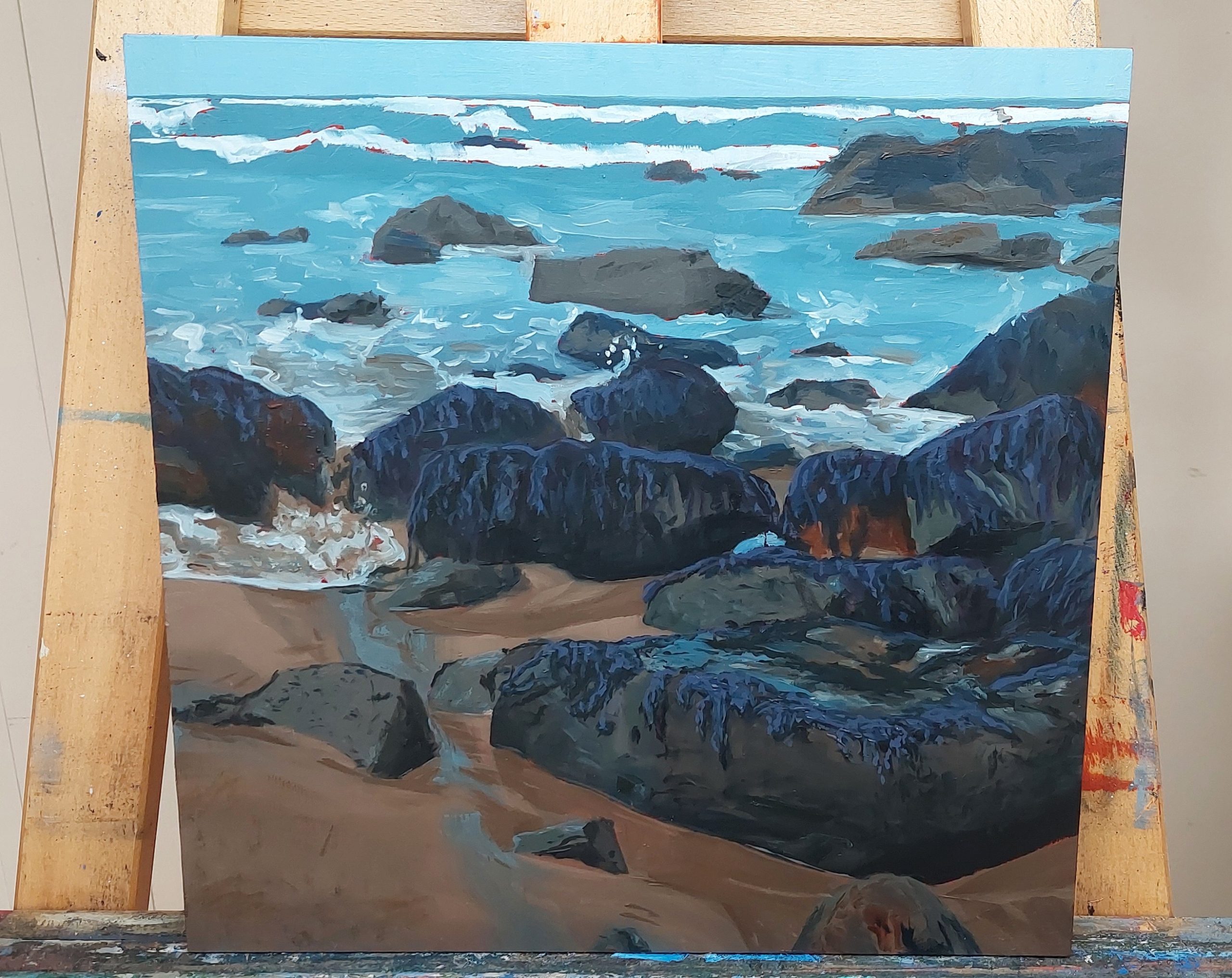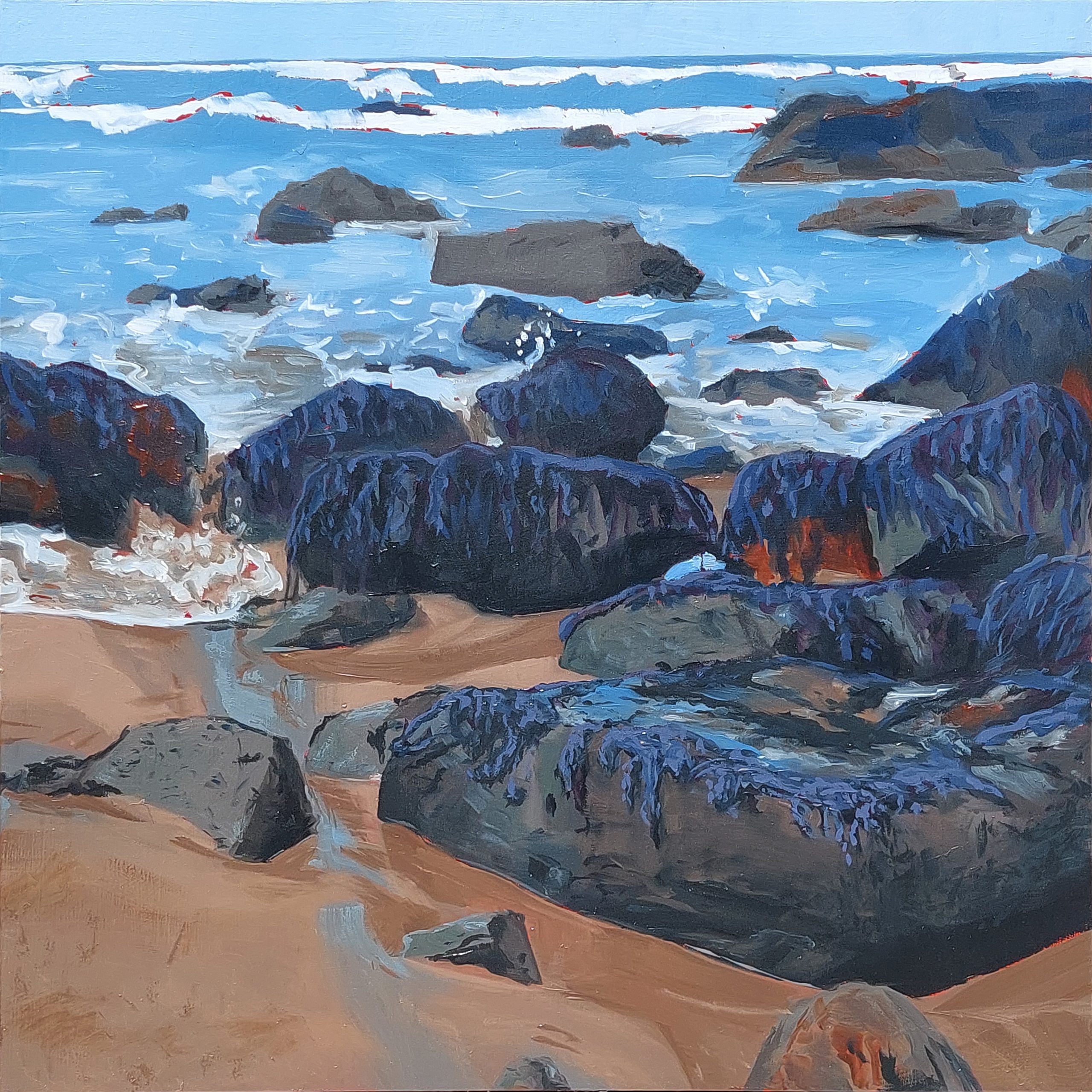“Keyhoe’s Edge,” an original oil painting, captures the raw beauty and untamed spirit of Keyhoe Beach at the farthest reaches of Point Reyes National Seashore. This 12″ H x 12″ W x .75″ D birch panel painting immerses the viewer in a dynamic coastal scene, where massive grey rocks, adorned with striking purple-blue seaweed, dominate the sandy expanse. The interplay of light and shadow, rendered with a square brush and liberal impasto, creates a palpable sense of movement in the cerulean waters, from the foamy waves crashing midway through the composition to the delicate drainage of tide pools around the nearest boulders. A vibrant burnt sienna underpainting peeks through the distant waves, adding an unexpected warmth and depth to this otherwise cool palette of blues, greys, and browns.