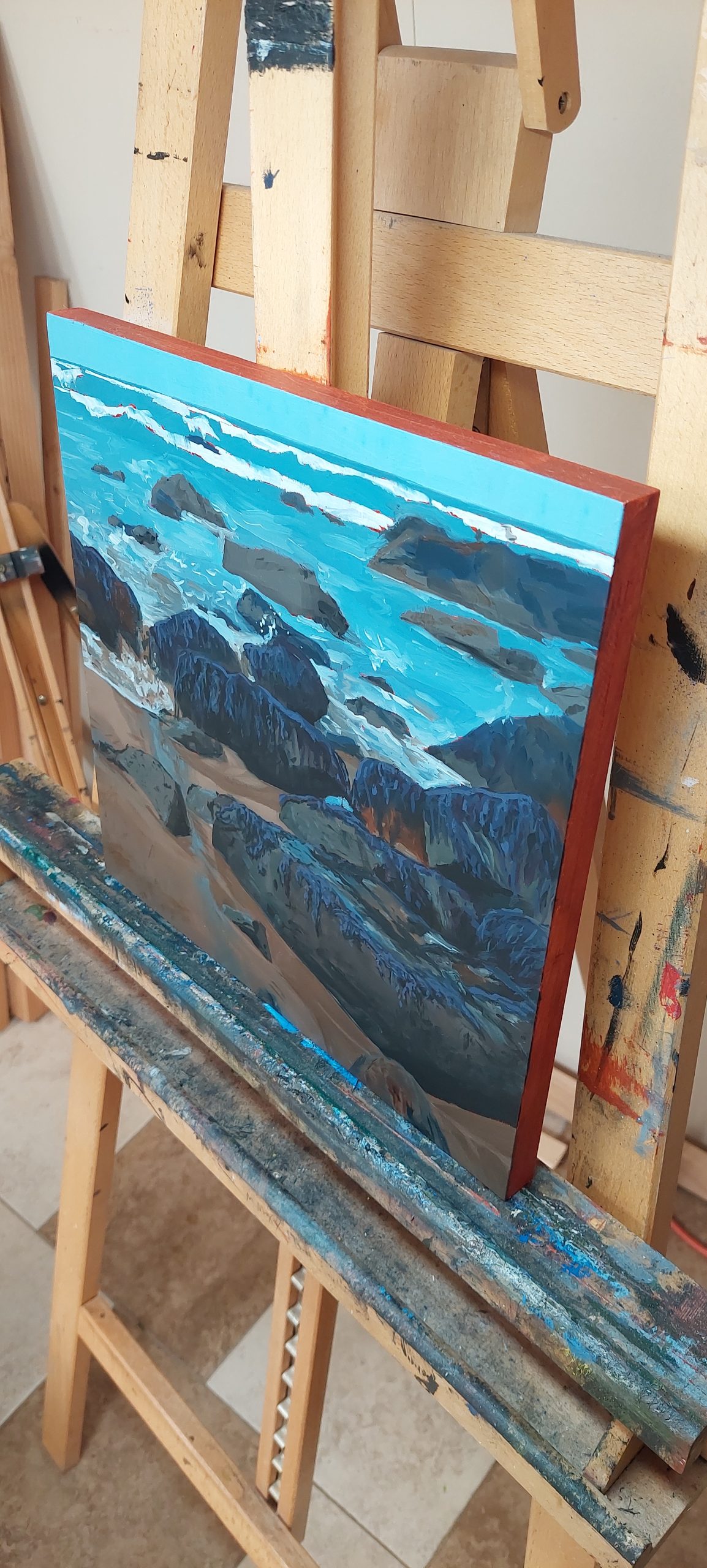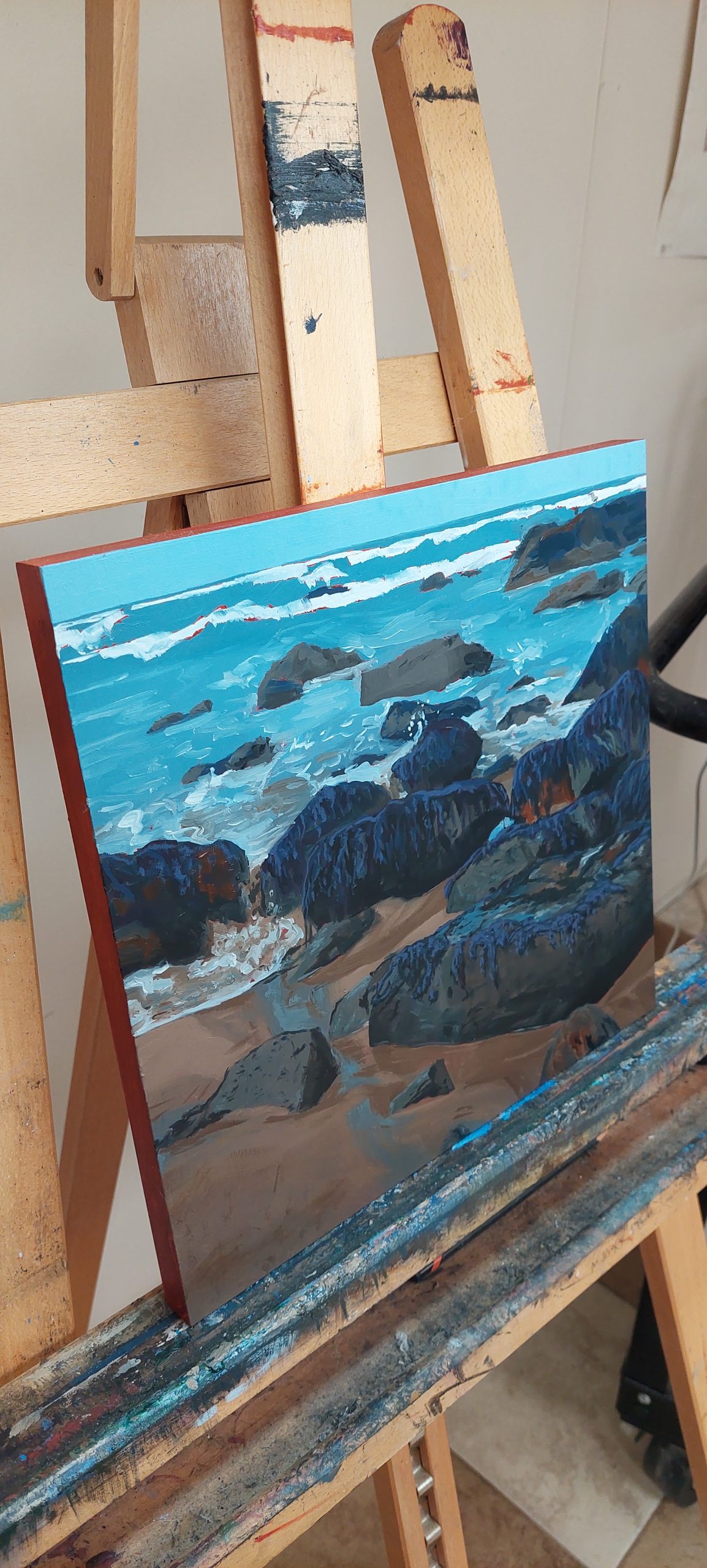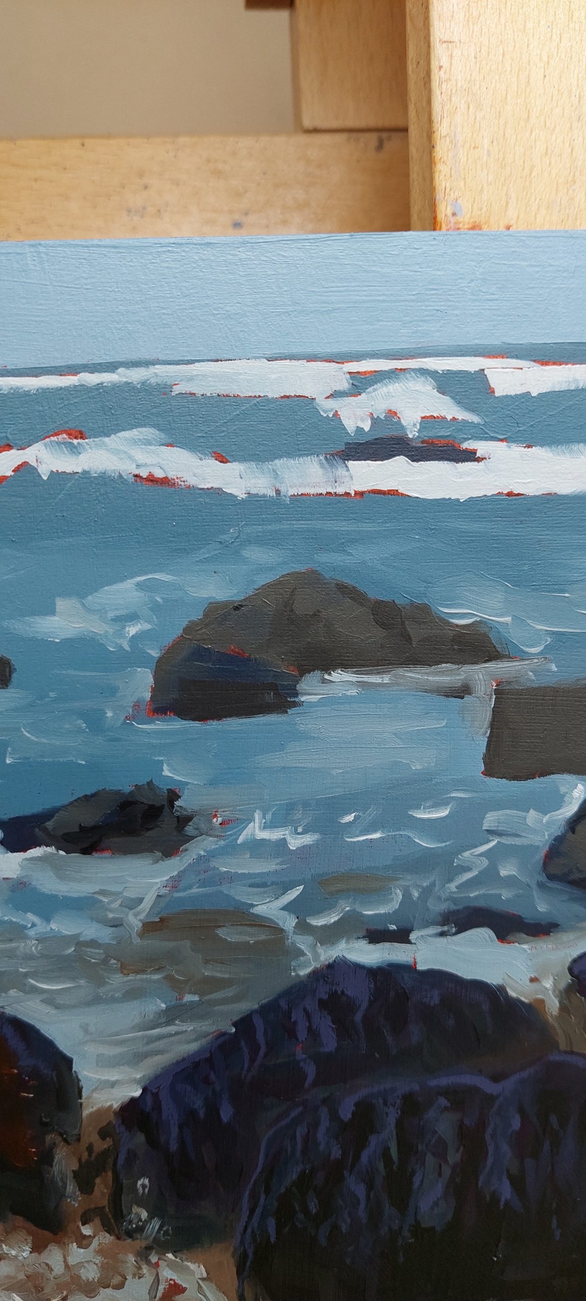 Executed in a captivating realistic-impressionistic style, this piece invites contemplation of the rugged Northern California coastline. The loose, angular brushstrokes not only define the forms of the ancient rocks but also evoke the very energy of the ocean, conveying both the immense power and serene beauty of this remote beach. The burnt sienna edges of the panel provide a cohesive and thoughtful framing for this vivid depiction of a beloved natural treasure. “Keyhoe’s Edge” is a compelling acquisition for collectors who appreciate the unique allure of Northern California’s dramatic shores, the captivating artistry of impressionistic landscapes, and the timeless appeal of coastal themes.